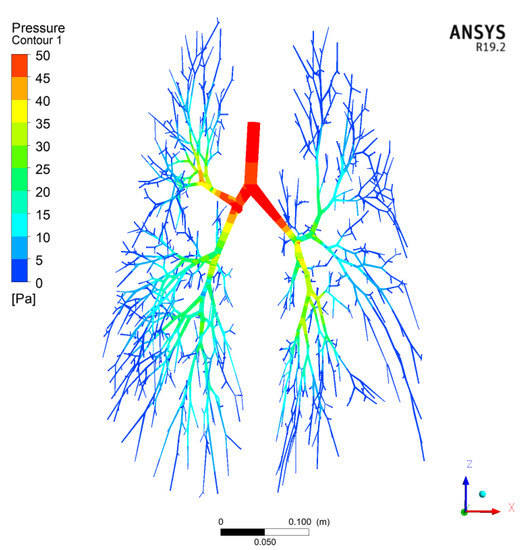 The airflow in the human respiratory airways is in a transitional laminar-to-turbulent flow and must be considered accurately and effectively. Most industrial flows include turbulent structures that cannot be resolved numerically on the currently available computers. To overcome these limitations, CFD methods are employed to solve Reynolds-averaged Navier–Stokes equations, using turbulence models to compute the averaged turbulent stresses. These models often limit the accuracy of CFD simulations. Ansys CFX CFD software offers a Shear Stress Transport (SST) k-ω turbulence model, which is one of the most effective turbulence models tested for accuracy [38], and Ansys Guide 2018. The SST model is developed by solving a turbulent/frequency-based model (k-ω) at the wall and k-ε in the bulk flow. A blending function ensures a smooth transition between the two models. In a NASA Technical Memorandum [39], the SST model was rated the most accurate model for aerodynamic applications. The SST k-ω model is used in the current CFD simulations of the particle deposition in the G0–G17 conducting airway generations for its accuracy. Kolanjiyil and Kleinstreuer [40] also used the Ansys CFX’s SST k-ω turbulence model in their computational analysis of the aerosol dynamics in a human whole-lung airway model at an inhalation airflow rate of 15 L/min. Figure 3 and Figure 4 show the gas velocity streamline and pressure contours for the CFD test case P-1 in Table 1.