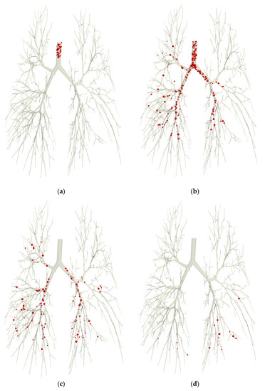 Movement progress of the computational particle parcels (without showing the deposited particles) at times t = 0.01 s (a), t = 0.09 s (b), t = 0.13 s (c), and t = 0.20 s (d) for the CFD test case P-1. Polydisperse particles (0.5 µm ≤ ≤ 5.5 µm) are injected, noted by the different (to scale) sphere sizes.