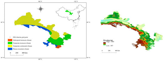Distribution of ERA-Interim grid points across four climate zones (left) and elevation information (right) of Gansu Province.