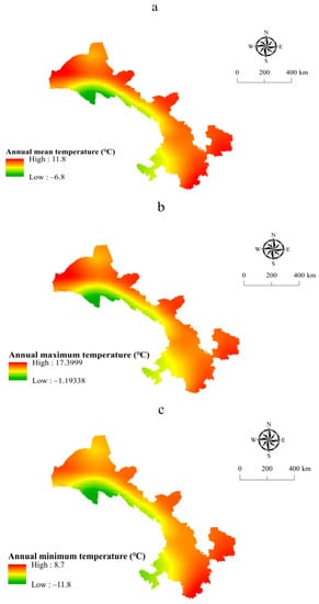 Distribution of ERA-Interim temperatures in Gansu Province. (a) Mean temperature. (b) Maximum temperature. (c) Minimum temperature.