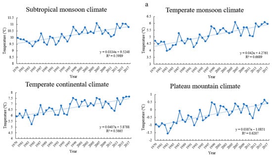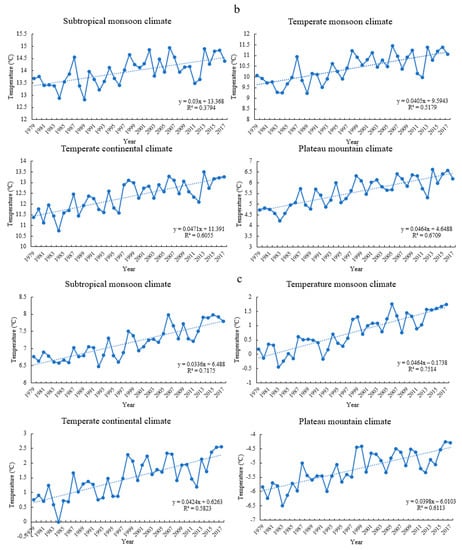 Trends of increasing daily ERA-Interim temperature data for the four different climate zones within Gansu Province during the period 1979–2017. (a) Mean temperature. (b) Maximum temperature. (c) Minimum temperature.
