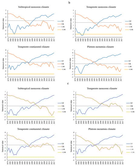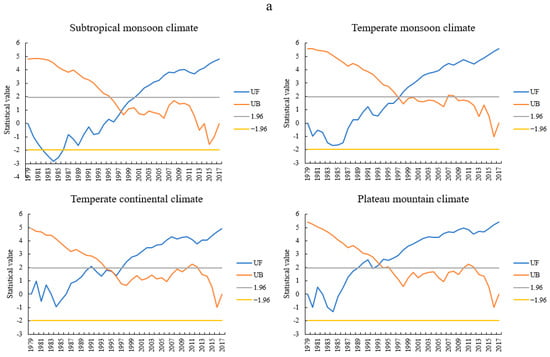In the formula, UB1 = 0, we graphed UFk and UBk, where values of UFk and UBk > 0 indicated that the temperature was increasing, and values < 0 indicated that the temperature was decreasing. Values of UFk and UBk passing the critical line indicated that the upward or downward trend was significant (±1.96). If the values exceeded the critical line (±1.96), it represented a significant increasing or decreasing trend. If the UFk and UBk curves intersect and the intersection was between critical lines (±1.96), the year corresponding to the intersection was accepted as the year when temperature shifted [23,24,25,26].
