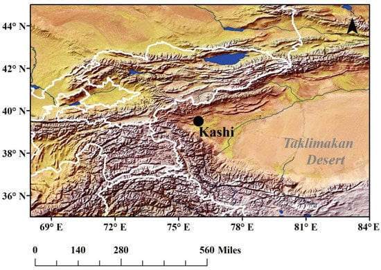 The current research mainly pays attention to the effects of local pollutants and transported dust on the optical and micro-physical characterizations of both total column and near-surface dust aerosols in a typical arid region. The Dust Aerosol Observation in Kashgar, China (DAO-K campaign) was conducted in April 2019. The observation site (39.504° N, 75.930° E, the altitude of 1320 m) in Kashgar shown in Figure 1 is located in the global dust belt, which ranges from the Sahara over the Arabian Desert to the Gobi Desert []. It is strongly influenced by desert dust sources [], especially in spring. Moreover, biomass burning and local pollutant emissions are also important sources for fine aerosol particles. Under different meteorological conditions, local emissions, transported dust, and/or background aerosols could potentially be observed at the site during the campaign.