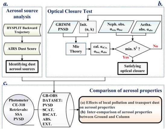 As a mixture, the absorption characteristics of dust aerosol depends on chemistry, size, and local emissions []. The vertical change of the absorption characteristics of dust aerosol is an important issue. Although Hu et al. [] analyzed the vertical change of aerosol extinction based on lidar observations in the DAO-K campaign, they did not show the vertical changes in the absorption characteristics. We compared the absorption characteristics of dust aerosols observed near the surface with those in the atmospheric column, indirectly indicating the difference between absorption near the surface and in the upper air. Thanks to the inversion of aerosol microphysical parameters by the sun–sky photometer, we can compare the Particle Volume Size Distribution (PVSD) and Single Scattering Albedo (SSA), in addition to the absorption characteristics. The detailed flowchart, including the optical closure and analysis process, is presented in Figure 2.