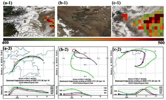 (a-1), (b-1), and (c-1) represent the MODIS true-color images, combined with the AIRS Level 2 Dust Score product, at 1:30 a.m. and 1:30 p.m. on 6, 20, and 24 April 2019. (a-2), (b-2), and (c-2) represent the backward trajectories (starting at 5:00 a.m. on that day, and ending at 5:00 a.m. on the next day), at altitudes of 300 m, 500 m, and 1000 m.
