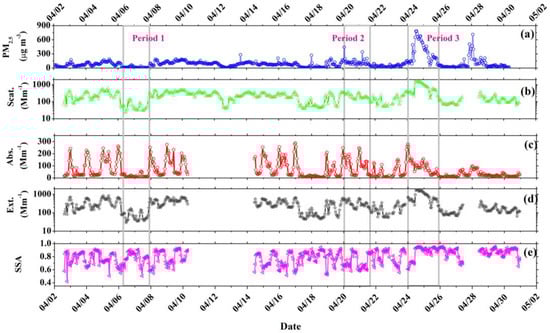 (a) PM2.5, (b) scattering, (c) absorption, (d) extinction coefficient, and (e) SSA measurements during the campaign.