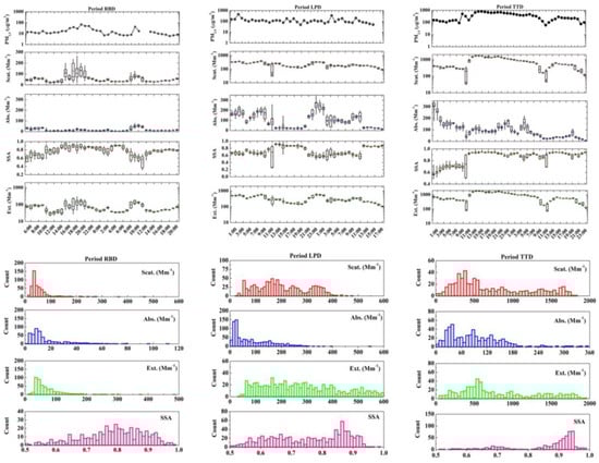 The diurnal variation and frequency histogram of the aerosol optical and physical characteristics during the Period RBD, Period LPD, and Period TTD.