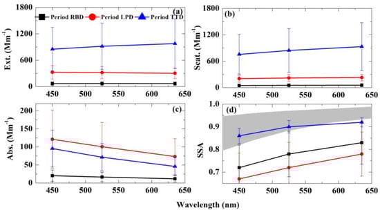 Spectral extinction coefficient (a), spectral scattering coefficient (b), spectral absorption coefficient (c), and spectral SSA (d) during Periods RBD, LPD, and TTD. The gray-filled area in (d) represents the spectral SSAs of 19 dust aerosols sampled over 8 regions, reported by Biagio et al. [].