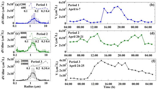 The mean particle volume size distributions measured from GRIMM during (a) Period RBD also called Period 1, (c) Period LPD also called Period 2, and (e) Period TTD also called Period 3. Starts at 5:00 a.m. and ends at 5:00 a.m. on the next day. The mean total volume concentrations (b,d,f) during the three periods.