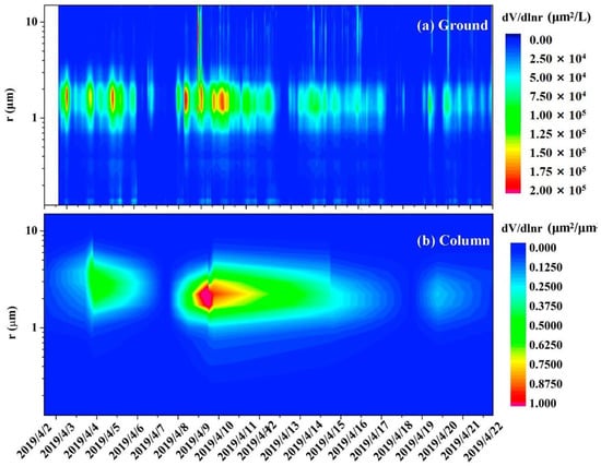 The aerosol vertical distributions are complex and related to chemical composition, topography, and meteorological conditions. Dust particles can be elevated to the free troposphere (above PBL) and transported over long distances. Meanwhile, regional circulations can also affect the aerosol vertical distribution, especially with high particulate concentrations. In this section, the observations, combined with a sun–sky photometer (CE318, CIMEL), allow the inter-comparison of particle volume size distribution between ground and column. The particle volume size distributions provided by CE318 are more smooth, due to the limits of the inversion algorithm.