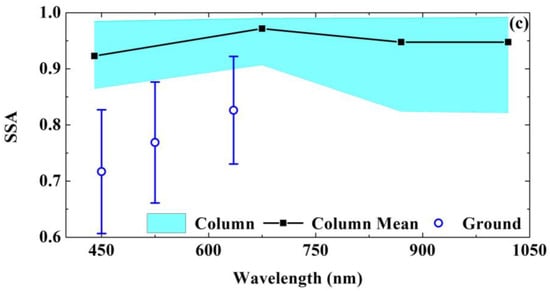 Figure 9a,b shows similar particle volume size distributions between the ground and column aerosols. The peak radius of the PVSDns mainly ranges from 1 μm to 2 μm, with the mean value of 1.56 ± 0.67 μm. The peak radius of the PVSDcol mainly ranges from 1.5 μm to 4 μm, with the mean value of 2.84 ± 1.08 μm. The peak radius of the PVSDcol is nearly twice as great as that of the PVSDns. This implies that the average particle size in the column atmosphere is larger than that on the ground. This can be related to the elevated dust particles. In addition, the peaks of the submicron particle volume size distribution are only observed on the ground. This indicates that fine particles, which are related to the topographically generated local circulation, are mainly distributed near the ground. Meanwhile, a few particles with radii larger than 6 μm are found for background aerosols near the ground. We also found an obvious difference of SSAs at visible wavelengths between the ground and column.