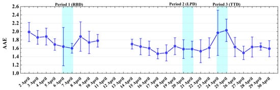 The Mass Absorption Cross-Sections (MACs) are reported to be 14.54 m2/g and 10.35 m2/g at 470 nm (λ1) and 660 nm (λ2), respectively []. The spectral absorption coefficients (αabs,λ1, αabs,λ2) can be obtained from multiplying the BC concentration observed from AE33 by MACs. Then, the AAE can be calculated by Equation (3). The computed average AAE is 1.68 ± 0.28 during the whole observation (Figure 10), which is obviously lower than the AAE value of the pure dust. This implies the existence of BC and BrC [,,]. The mean AAE value (1.58 ± 0.21) recorded during the period dominated by LPD, was similar to the values of 1.5 ± 0.1 for polluted dust, reported by Lee et al. [] and Yang et al. []. In comparison to the RBD AAE (1.62 ± 0.29), the decrease in AAE may be caused by the increase in BC particles during the Period LPD. The daily mean AAE values were about 2.0 during the period dominated by TTD, which were the highest values during the whole observation. Similar AAE values of dust-dominated aerosols were also obtained in similar cases [,,]. This can be attributed to the strong wavelength dependence of light absorption by pure dust particles.