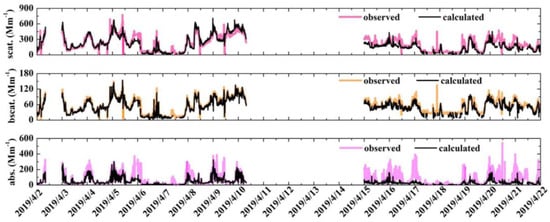 The consistency of the ground multi-instrument measurements was proved by the optical closure calculation from 2 to 21 April (shown in Figure 11). Except for the direct observations of the instrument, the extinction, scattering, and absorption coefficients can be also calculated from particle number size distribution measurements indirectly based on the Mie theory. The results also show that the deviation between the mean observation (216.47 Mm−1) and calculation (212.67 Mm−1) of the scattering coefficient is 7.68%. The deviation between the mean observation (56.02 Mm−1) and calculation (52.06 Mm−1) of backscattering coefficients is 4.46%. Meanwhile, the variation trend of the calculated results is consistent with that of the observation obtained from the nephelometer. The relatively large difference of observed (~79.01 Mm−1) and calculated (~46.14 Mm−1) absorption coefficients was found. However, the fitting residual error (Equation (2)) of all the retrieval results is less than 0.30, as shown in Figure 11. It is worth noting that particles are assumed as spherical and chemically homogeneous in this optical closure test. Hence, the large deviation between the calculations and observations is related to the use of this assumption during the whole treatment. Furthermore, different calibration principles among instruments also affected the consistency of the multi-instrument measurements to some extent.