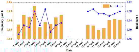 In addition to the performance of the consistency check, the complex refractive index can be simultaneously retrieved based on the optical closure method []. The real and imaginary parts of the retrieved complex refractive index from 2 to 21 April are shown in Figure 12. The lines and bars represent the daily mean real part n and imaginary part k of the complex refractive index at 532 nm. The real part of the refractive index varies from 1.58 to 1.69, with the average value of 1.64. There is a similarity of the real part of the refractive index between the total column and near-surface aerosols. The results also show that the imaginary part of the refractive index varies from 0.029 to 0.056, with an average value of 0.039. The large retrieval results of the imaginary part of the complex refractive index can indirectly prove the strong absorbability of aerosols in Kashgar. It is also found that the imaginary part of the refractive index decreases, following the decrease in the absorption coefficient.