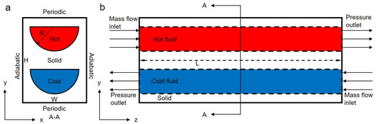 Boundary conditions and geometry configuration of a double bank unit in the straight PCHE. (a) Front view of cross section and (b) Side view along flow direction. The detail of geometry configuration is the following: R = 0.8 mm, W = 2.1 mm, H = 2.8 mm, L = 221.4 mm.