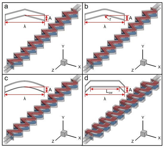 Computational domain of the four wavy channels. (a) Zigzag channel; (b) Fillet channel; (c) Sinusoidal channel (Sin channel); (d) Trapezoidal channel (Trape channel). Insert: top view of the wavy channel in a half period.