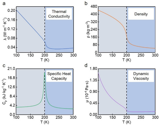 During the heat exchange process, methane has undergone a transition from a supercritical state to a liquefied state. According to Ma [20], there are no volume changes and no interface between the two states in the trans-critical process, therefore, the methane could be treated as a single-phase flow. Figure 3 shows the variation of thermo-physical properties of methane under working conditions. Since the focused properties drastically change with a temperature near the pseudo-critical point, we describe them through piecewise fitting, of which the fitting error is less than 1%. As for nitrogen and solid material, simple polynomial fitting is adopted because their thermal physical properties change gradually in the heat exchange process [21].