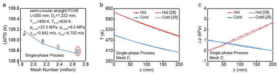 Due to the lack of experimental results of trans-critical liquefaction of NG, and given that the NG can be treated as single-phase flow during this process [20], we finally adopted the data of coupling heat transfer of single-phase carbon dioxide in PCHEs to validate the current model [28]. Before validation, we first performed a mesh independence test on the single-phase model to ensure the grids had no effect on the calculation results (Figure 4a). When the mesh number increased from point C to D, the Logarithmic Mean Temperature Difference (LMTD) only increased by 0.39%, therefore, the grid’s number corresponding to point D was selected for subsequent calculations. The numerical results of the current model (Figure 4b,c) are highly consistent with the results in the literature [28], where the maximum relative error of bulk temperature and pressures are 0.77% and 18.28%, respectively, indicating the present model is feasible.