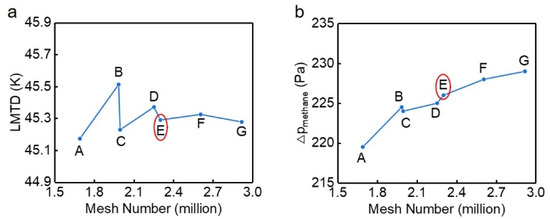 We conducted a mesh independence test separately for the nodes number in the cross-section and along the flow direction. The logarithmic mean temperature difference (LMTD) of the PCHE and the pressure drop of the hot fluid were chosen as the two criteria in this work. Figure 5 depicts that, for both criteria, the relative difference between the numerical results corresponding to points E and G is within 1.5%, so we chose the mesh number corresponding to point E.