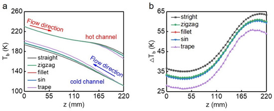 From Figure 6a, the temperature of hot fluid changes rapidly with the position in the entrance and exit segments of the channel, this is because the specific heat capacity of methane is relatively small in these locations. At the selected operating pressure, the pseudo-critical temperature of methane is 199.6 K, which is approximately at z = 131 mm for all the channels. When the temperature of methane is in the range of trans-critical process, the hot fluid would release a large amount of heat due to the sharp increase in specific heat capacity (Figure 3), while the specific heat capacity of nitrogen did not change significantly, therefore, a plateau of temperature appears near the pseudo-critical point. After methane reaches the liquefied state, the distribution of temperature among the five channels begins to show differences. Finally, the trapezoidal channel achieved the maximum temperature drop of 66.0 K, the straight channel produces the minimum temperature drop of 56.4 K, and the remaining three channels achieve almost the same temperature drop, which is 60.0 K. As for the cold fluid, it is the trapezoidal channel that shows the most significant temperature rise of nitrogen as well, and a corresponding smallest heat transfer temperature difference is illustrated in Figure 6b. In all the channels, the temperature difference between the hot and cold fluids changes severely with a position near the pseudo-critical point, which is also due to the dramatic change in the thermal physical properties of methane in the process of coupling trans-critical heat exchange.