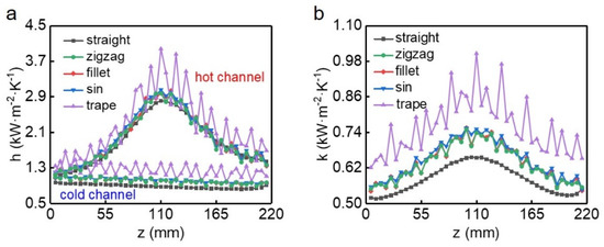 Then we calculated the local convective heat transfer coefficients (h) and local heat transfer coefficients (k) for different types of channels (Figure 7). In all channels, the maximum local convective heat transfer coefficient of methane appears before the pseudo-critical point (ca. 110 mm), this is because the temperature of methane in the thermal boundary layer first reduces to the pseudo-critical point, where methane reaches the peak value of specific heat capacity [20]. However, on the cold fluid side, the variation of h with positions is less obvious compared to the hot fluids. The flow direction and velocity magnitude of the fluids would change at the corners of the wavy channels, this perturbation to the flow would greatly disrupt the structure of the thermal boundary layer and improve the local performance of heat transfer. Thus, the local convective heat transfer coefficients in these locations are higher than that in non-corner regions, which is shown in Figure 7a as the fluctuation of the coefficients h along the streamwise direction. Since the number of bends in the trapezoidal channel is twice that of the other three wavy channels, the fluids are most disturbed in this channel, and the fluctuation of the local convective heat transfer coefficients is most severe. The variation of local heat transfer coefficient k is similar to that of h in the hot channel, and the difference in the baselines of k among the channels mainly comes from the difference of h in the cold channel (Figure 7b). Of the five channels, the trapezoidal channel has the best heat transfer performance, followed by the zigzag, fillet and sinusoidal channels, with the straight channel last.