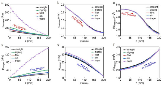 In order to study the causes of resistance, we investigated the flow characteristics of hot and cold fluids in the process of heat exchange. Among the five channels, the trapezoidal channel has the longest total length and the largest number of corners, resulting in the largest pressure drop which is 3.0 times larger than that of the remaining three wavy channels and nearly 4.5 times larger than that of the straight channel (Figure 8a). Additionally, since the friction loss at the corners is larger than that at non-corners, the pressure drop gradient at these positions is larger, hence the pressure drop in the wavy channels shows a stepped distribution. During the trans-critical process, the density of methane increases sharply, leading to a rapid decrease in its velocity in the streamwise direction (Figure 8b). When the methane completely enters the liquefied zone, the variation of velocity tends to be flattened due to the slight changes in the density. Likewise, the Reynolds number of methane greatly descends near the pseudo-critical point (Figure 8c). It is worth noting that, among the five channels, velocity and Reynolds number of methane differ only after the fluid reaches its liquefied state, which is consistent with the temperature drop. The pressure drop and velocity of the cold fluid are much larger than those of the hot fluid (Figure 8d,e), this is caused by the difference in mass flow rate and thermal physical properties between the two working fluids. During the whole heat exchange process, although the velocity of nitrogen is increasing, its Reynolds number decreases along the flow direction (Figure 8f), which indicates that the effect of increasing viscous force is dominant.