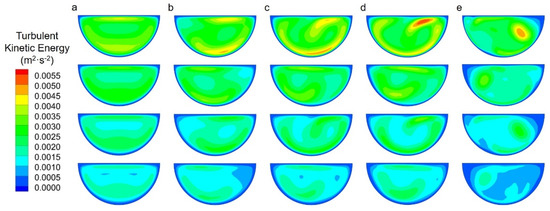Turbulent kinetic energy contour of methane along flow direction in (a) Straight channel, (b) Zigzag channel, (c) Fillet channel, (d) Sinusoidal channel, (e) Trapezoidal channel.