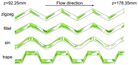 The Q criterion (Q = 10,000) was adopted to obtain the vortex structure of the hot fluid among different channels in the range of z = 92.25 to 178.35 mm (Figure 10). In all the wavy channels, the vortex intensity is larger at corners, which increases the local pressure drop gradient and local heat transfer performance at these locations. Part of the strong vortex vanishes as the flow develops at non-corners; therefore, the friction loss is reduced, and the heat transfer enhancement is weakened. The vortex in the trapezoidal channel is strongest, which is consistent with the results shown in Figure 7 and Figure 8.