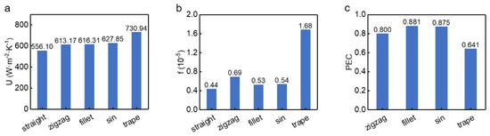 Compared with the straight channel, the coefficients U of the other four wavy channels can be improved by 10.26%, 10.83%, 12.90% and 31.44%, respectively. Although the coefficients f would be increased by 56.82%, 20.45%, 22.73% and 281.82% in wavy channels. Consistent with previous results, the trapezoidal channel has the largest heat transfer coefficient and fanning friction factor. However, the PECs of the four wavy channels are all less than 1.0, indicating that the benefit of heat transfer enhancement could not offset the penalty of flow deterioration.