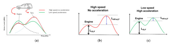 (a) Visualization of the spectral content of engine and tyre noise for two situations, high and low speed. (b) The two noise parameters, engine noise and cruising noise for a high-speed traffic situation. (c) The two noise parameters for a low-speed traffic situation with acceleration.