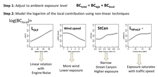 The resulting instantaneous model required a correction for the ambient concentration of the black carbon exposure of the cyclists, but the main short-term variability is explained by a combination of engine noise, wind speed, cruising noise and the street canyon property (see Figure 2). The technique was applied on several occasions, resulting in similar models for Bangalore, India and New York (USA) [12,13]. The main feature of the methodology is the potential to disentangle the traffic dynamics from the meteorological condition, including the ambient concentrations and the fact that the traffic and traffic dynamics can be quantified by unattended noise measurements only. The meteorological bias and the seasonal bias in the air pollution assessments can be resolved to estimate route-specific exposure for both the specific meteorological conditions and for yearly averages [14]. On a different occasion, the trip-by-trip variation in an air pollution-only project was retroactively predicted by measuring the cyclist’s noise exposure on the designed routes two-and-a-half years after the air pollution campaign, resulting in a correlation of 0.75 and higher [15]. Overall, this methodology has proven to be robust and efficient.