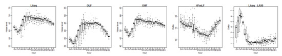 In Figure 3, the diurnal patterns of the noise parameters are visualized. The diurnal pattern of OLF shows a larger diurnal variation compared to LAeq (15 dB versus 10 dB). The interquartile range of OLF is larger during the early morning compared to LAeq and OHF. The difference between LAeq and LA50 is shown to illustrate the changing noise situation during the night. When those parameters differ, the noise time series becomes eventful; single vehicles can be detected as separate events. The equivalent acoustical energy LAeq is very sensitive to single events with high maximum values. LAeq is not very sensitive to short quiet periods, while LA50 is sensitive to those quiet periods.