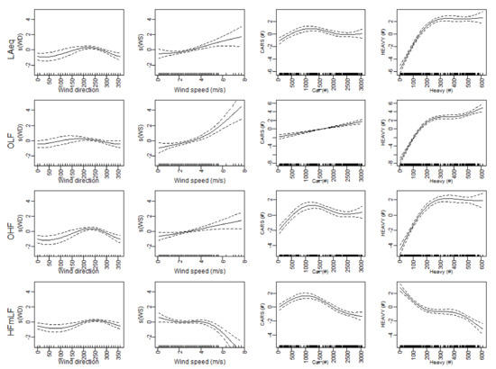 The GAM models are constructed in two variants, a basic version with only the wind speed and wind direction as external covariates and a meteorological extended version, including temperature and humidity. In Figure 4, the four basic traffic models for LAeq, OLF, OHF and HFmLF are presented. In this section, the OHF is included to illustrate the functionality of the HFmLF noise parameter. The only model with a positive correlation with both the number of cars and trucks is the engine noise OLF. The contribution of heavy vehicles saturates at relatively low levels (250 vehicles per hour). The relation between car traffic is low to non-existing for both LAeq and OHF; the heavy traffic showed a positive relation but saturates from 200 vehicles per hour. The behavior of OHF is very similar and indicates that the higher frequencies in the spectrum determine the LAeq value.
