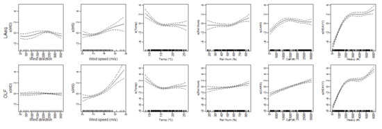 The noise measurements were affected by the meteorological conditions, wind speed, wind direction, humidity, the temperature of the air and the road surface, stability of the atmosphere and others. Evaluating the impact of these variables is—despite the short distance to the source—still relevant. In the basic model, the wind speed and wind direction are included. In this section, the impact of temperature and humidity is included in the models. Only two models are retained in this section, ‘LAeq_meteo’ and ‘OLF_meteo’. To compare the two approaches, the details of the GAM model are presented in Table 1 and the resulting splines in Figure 5. Lower temperatures result in higher values. This is an established acoustic phenomenon related to various physical properties of vehicle noise emission (rubber becomes softer and produces less noise, the same issue applies to road surfaces). The most relevant in this context is the harder rubber of the tyres at colder temperatures, resulting in noisier tyre–road surface interactions. The typical value is 1 dB decay per 10 °C [10]. The increase in the noise level with relative humidity is related to the wet road surface; relative humidity acts as a proxy for rain. Tyre–road interactions emit more high-frequency noise due to the splashing of the water, but a film of water will also increase the acoustical properties of the road surface at low frequencies. The effect of a wet road surface is stronger in LAeq than in OLF. Adding the additional meteorological variables does not affect the comparison. Note, however, that temperature expresses a similar diurnal pattern as the traffic densities and is therefore partially competing with the traffic variables. This effect is stronger in the LAeq model compared to the OLF model, which supports the OLF approach even further.