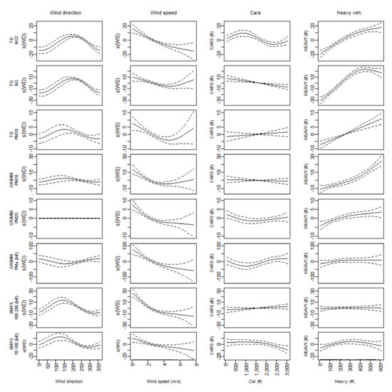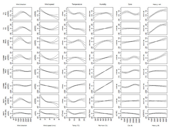 The basic air pollution models match the structure of the noise-traffic models with four covariates: wind direction, wind speed, the number of cars and heavy traffic. The results of the models are presented in Table 2 (bottom half). Figure 6 shows the splines for a relevant selection of the models.