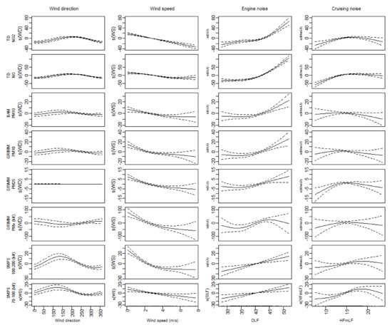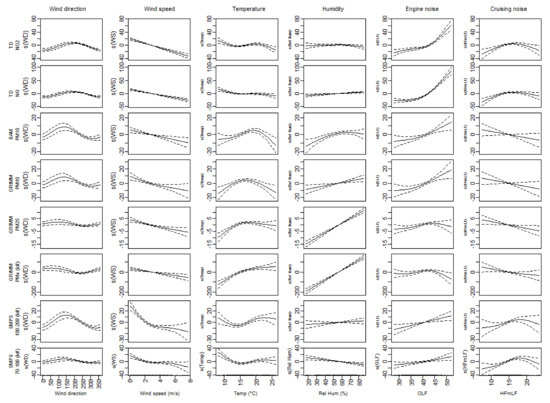 In this section, the basic noise-air pollution models are extended with temperature and relative humidity. The results of the models are presented in Table 3 (top half). Figure 9 shows the splines for a relevant selection of the models. The range of the ‘deviance explained’ shifts from 0.22–0.66 to 0.21–0.73. Similar behavior for the inclusion of the meteorological variables is visible. The NO, NO2 and NOx models show higher ‘deviance explained’ and the confidence intervals of the splines are reduced. Adding the meteorological variables strengthens the models and supports the engine noise and cruising noise as valid traffic proxies.