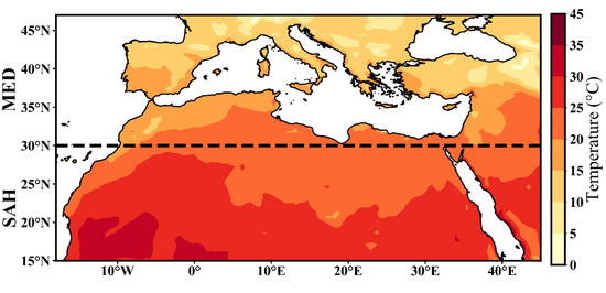 Spatial plot of mean temperature during 1979 to 2014 over the study domain: Mediterranean (MED) and Sahara (SAH), based on the Climate Prediction Centre (CPC). The study region is demarcated (dashed black line) following Iturbide et al. [42].