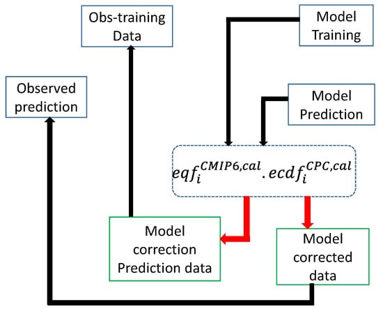 The flowchart (Figure 2) shows the testing for reliability of the quantile bias correction approach with two input data sources for observation and model simulations that are inputted for the transform function in Equation (1). The functions of ( , shows empirical quantile function; the inverse of the CDF and the operator (°) denotes the function’s content. The refer to the GCMs simulations and observed temperature products, respectively. The superscript refers to calibration, while the superscript refers to validation. The output, which is model corrected, is then used for the validation process. For instance, the model for future correction uses three input files for bias corrections (i.e., observed historical data, model simulated historical data, and the model scenarios for future data). The effectiveness of the approach is tested using empirical cumulative distribution function (ECDF) where models before and after are presented to show the reduction of biases in temperature datasets to be used for the examination of extreme events.
