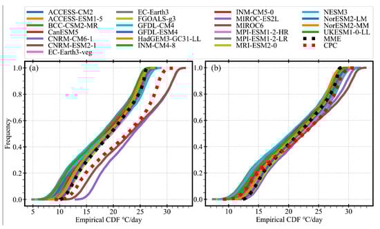 Empirical cumulative distribution function (ECDF) of GCMs and their multi-model mean ensemble (MME) (black dotted line) before (a) and after (b) bias correction, relative to the CPC data (red dotted line).