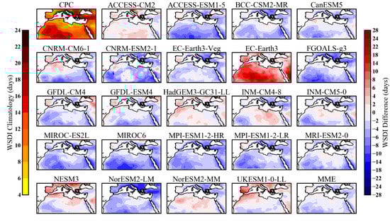 Spatial distribution of warm spell duration index (WSDI) difference from the CMIP6 GCMs (Table 1) and their MME during 1979–2014. The first plot shows the climatology of (WSDI) from CPC. The model difference is calculated as model (before correction) minus CPC.