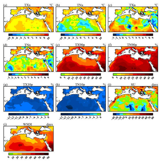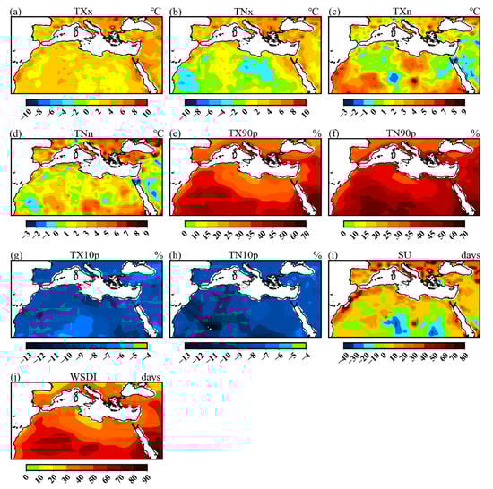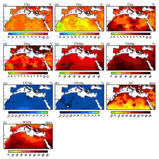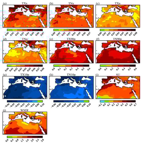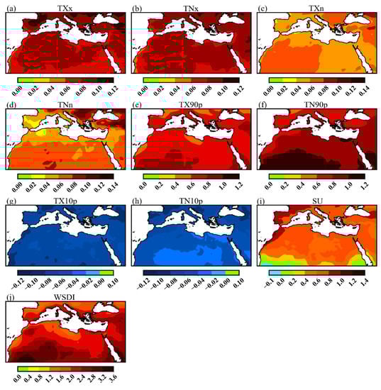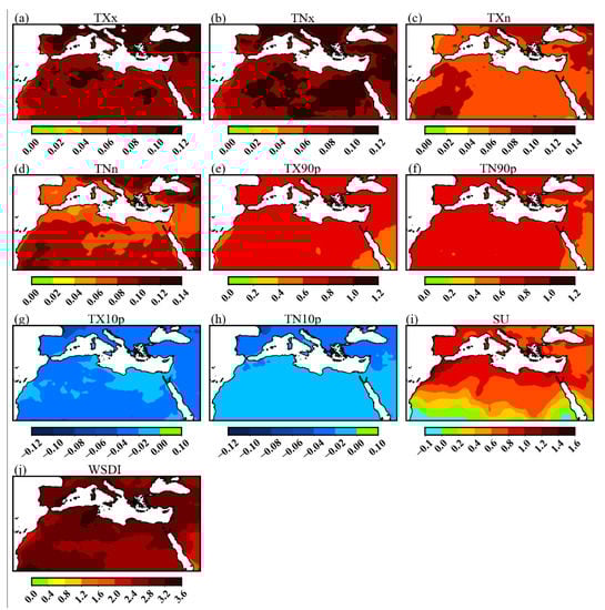 - It is evident that the region will experience statistically significant increasing trends in TXx, TNx, TX90p, TN90p, SU and WSDI during both the mid- and far-future under the SSP2-4.5 and SSP5-8.5 scenarios. Conversely, TX10p and TN10p reveal statistically significant decreasing trends (−0.01 to −0.12/year) over the study region in both timescales and scenarios under consideration. Spatial trends for TXx and TNx depict robust changes over MED under the SSP2-4.5 scenario during the mid-future with a significant positive overall trend and in the far-future with uniform positive trends under the high emission scenario during the two time periods. Overall, these results suggest that the region will experience a high increase in the intensity, duration, and frequency of hot extremes, while the cold extremes will generally decline over the entire study area.