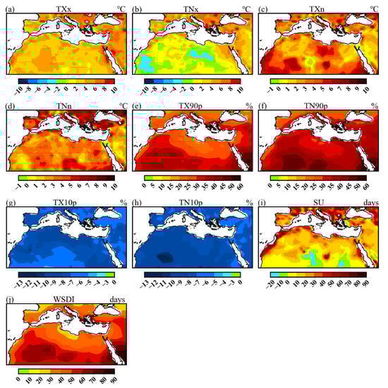 Projected changes in extreme temperature from multi-model ensemble mean CMIP6 GCMs bias-adjusted data during the mid-future (2041–2070) relative to the baseline period (1995–2014) for the SSP5-8.5 scenario. The indices reflect the intensity (TXx, TNx, TXn and TNn) (a–d), frequency (TX90p, TN90p, TX10p, and TN10p) (e–h) and duration (SU and WSDI) (i,j) of the extreme events.