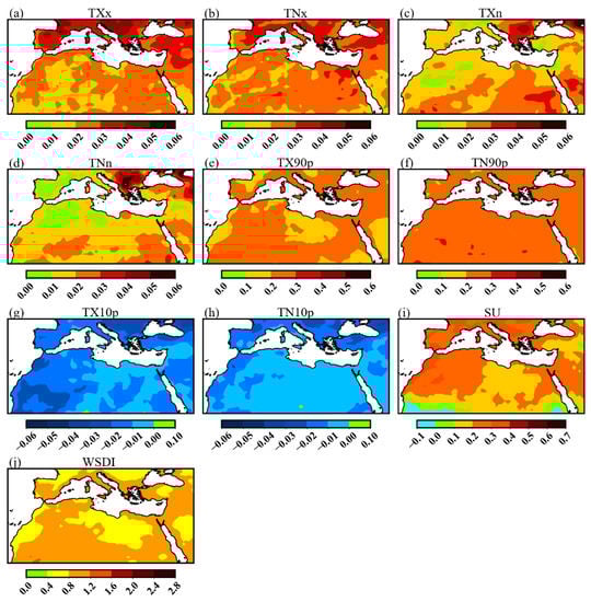Spatial trends of extreme temperature from the multi-model ensemble mean of CMIP6 GCMs bias-adjusted data for the mid-future (2041–2070) relative to the baseline period (1995–2014) for the SSP2-4.5 scenario. The indices reflect the intensity (TXx, TNx, TXn and TNn) (a–d), frequency (TX90p, TN90p, TX10p, and TN10p) (e–h) and duration (SU and WSDI) (i,j) of the extreme events.