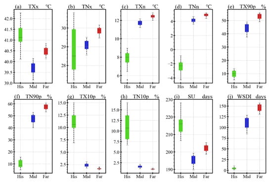 Projected changes in extreme temperature spatially averaged over the study domain during the mid- (2041–2070) and far-future (2071–2100) relative to the baseline period (1995–2014) for the SSP2-4.5 scenario. The indices reflect the intensity (TXx, TNx, TXn and TNn) (a–d), frequency (TX90p, TN90p, TX10p, and TN10p) (e–h) and duration (SU and WSDI) (i,j) of the extreme events. For each box plot, the horizontal line represents the median and central uncertainty range of the temperature index across the CMIP6 MME. The whiskers extend to the 10 and 90% uncertainty range.