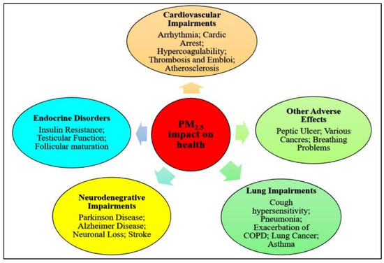 The World Health Organization (WHO) has reported that 9 out of 10 people breathe air containing high levels of pollutants, and it is also estimated that air pollution is responsible for approximately 7 million deaths every year [1]. The burden of ill-health is not equally distributed, as approximately two-thirds of deaths occur in the developing countries of Asia. Air pollution in Asian countries is mainly due to increasing trends in economic and social development. In India, rapidly increasing industrialization, urbanization, and demand for transportation influence air pollution in many Indian cities [2]. The major health impacts of air pollutant PM2.5 are shown in Figure 1, which indicates that PM2.5 is the main air pollutant responsible for the most significant health problems viz. impacts on the central nervous system, breathing problems, chronic obstructive pulmonary disease, lung cancer, cardiovascular diseases, impacts on the reproductive system, etc., [3,4]. Therefore, it is of utmost importance to determine and forecast the PM2.5 concentration with more reliable and better forecasting models.