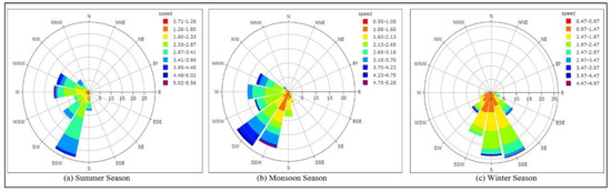 As observed from the wind rose diagram (Figure 3) and from Table 6, slow and the infrequent wind blows during the winter season. To present a detailed analysis of WD, the wind rose diagram is plotted in sixteen directions from N to NNE (counterclockwise). The concentric circles in the wind rose diagram represent the probability percentage of wind blow, and are labeled with percentages increasing outward. As shown in Figure 3, the probability percentage concentric rings are placed at 5% intervals. For analysis, the WS is divided into nine bins and the bins are differentiated, with colors ranging from red to brown. The length of spoke around the circle is related to the frequency of time that the wind blows from a particular direction. The dominant wind directions during the winter season were found to be in the SSE and S directions, with a small secondary lobe in the SSW direction, and with minor lobes in the SW and SE directions, indicating less frequent wind blow in these minor lobe directions. The winter season observed a mean WS of 1.85 m/s, and approximately 65% of the time the wind blew in the direction of SSW to SSE (230–305 degrees). During the season, only 1–2% of infrequent high-speed winds (greater than 4.47 m/s) were observed. Approximately 20–25% of the time the wind blew at a speed of 2.47 m/s to 2.97 m/s. During the remaining time, the wind blew at a speed of less than 1.47 m/s. The summer and monsoon seasons observed frequent and high-speed winds during the period of observation, and the wind blew mainly in a southwest direction (primarily in direction of 180–250 degrees). During the monsoon season, approximately 40–45% of the time the wind blew with a speed greater than 3.18 m/s, and approximately 8–10% of the time the wind blew with a speed of 4.23 m/s to 4.75 m/s. However, infrequent WS greater than 4.75 m/s blew for approximately 1–2% of the entire season. Similar high-speed winds were observed for the summer season, with a SSW prominent wind direction. For the summer and monsoon seasons, the high-speed winds swept the air pollutants away from the city, hence, a low concentration of PM2.5 was observed during these months.