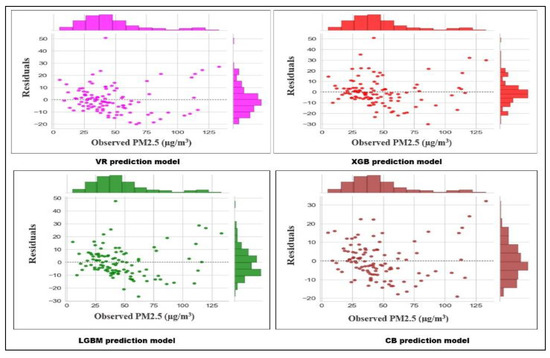 Figure 5 presents the residual error plots with their histograms showing residuals of the regression models evaluated for the test dataset. The results report that for XGB and VR regression models, the residuals and histogram peaks reside at around 0 to −20, yielding negatively biased results. It indicates that the model’s prediction was too high, and that the models probably predict higher PM2.5 concentration than compared with observed PM2.5 concentration. The LGBM model shows satisfactory improvement having a random and dispersed distribution of residual. However, the model observes low negatively biased residual error, and the results turn out to be slightly negative, biased with a moderate difference between predicted and observed PM2.5 concentrations. Amongst all the fifteen implemented models, the CB model shows significant prediction performance with minimum residual error. As observed from the residual error plot Figure 5, the model is least biased to positive and negative residuals and shows random residual distribution. The residual error in CB lies in the range of −20 to 30, with maximum residual present in the range of −10 to 10.