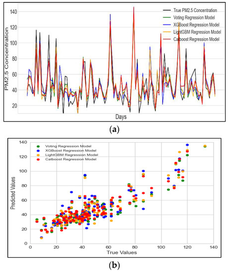 Time series and scatter plot between true and predicted PM2.5 concentrations for the test datasets are presented in Figure 6. As marked in Figure 6a, the models show adequate prediction performance and, as compared with other models, the CB model relatively follows the true PM2.5 concentration. The scatter plot presented in Figure 6b shows that in contrast to VR, XGB and LGBM models, the CB model predicts PM2.5 concentration in the proximity of observed/true PM2.5 concentration at maximum instants of time. For the CB regression model, Figure 5 and Figure 6 show fine agreement between the observed/true and predicted PM2.5 concentrations.