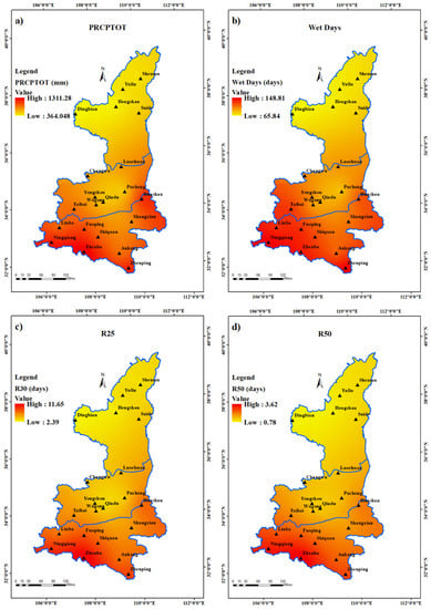 3.1. Spatial Analysis of Precipitation Indices