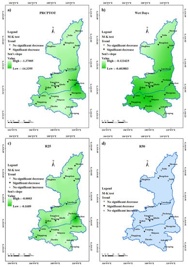 3.2. Trend Analysis of Extreme Rainfall Indices